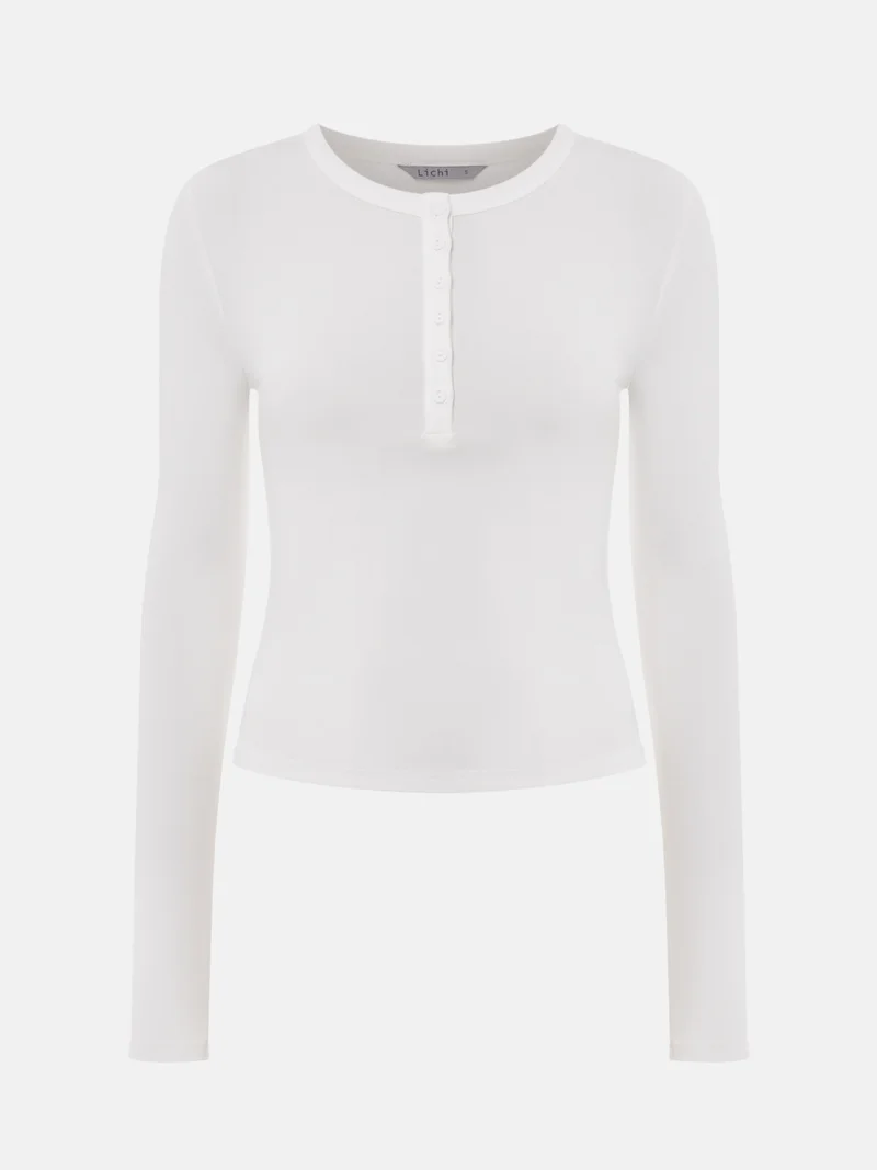 Versatile fitted longsleeve with a deep round neckline, finished with a row of small tonal buttons. - full length - fitted silhouette - round neckline - button fastening - long sleeves
