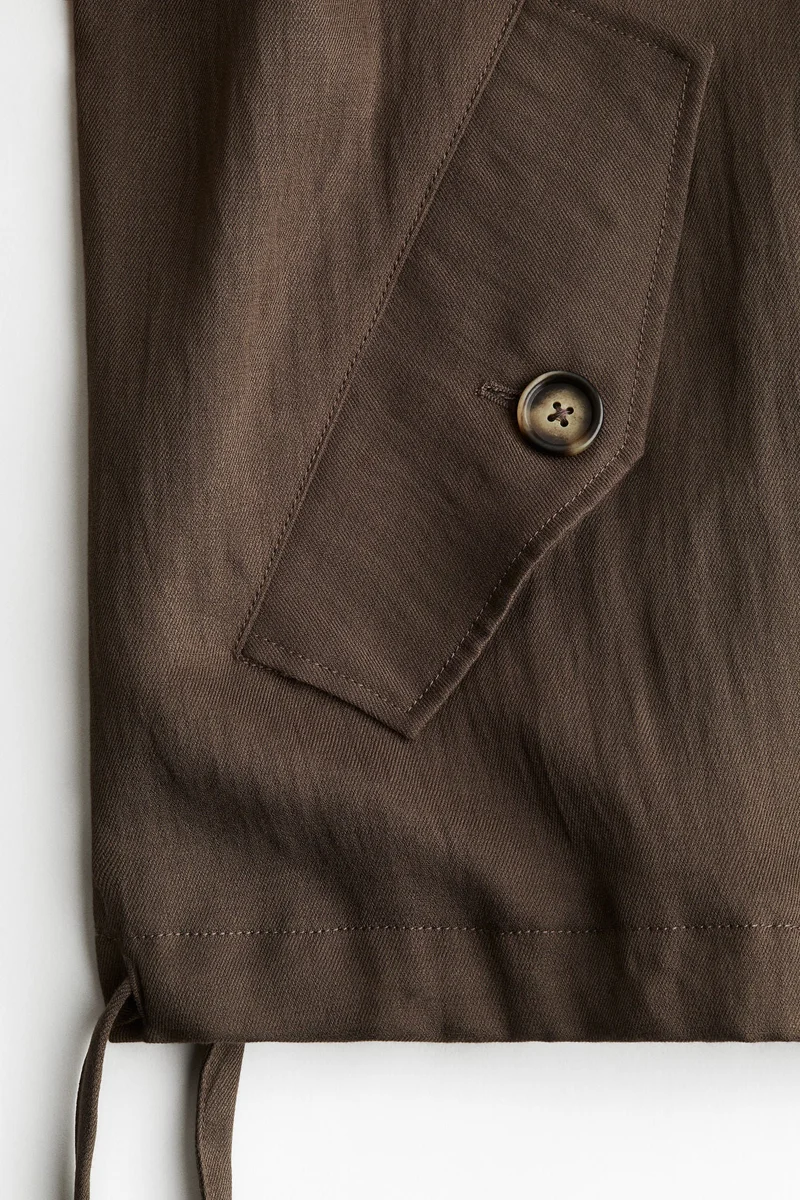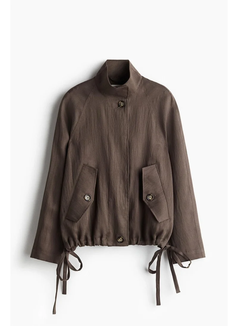 Loose-fit jacket in twill featuring a stand collar and placket with concealed press-studs down the front and a visible button at the top and bottom. Raglan sleeves and diagonal front pockets with a flap and button. Drawstrings at the hem that tie at each side. Unlined.