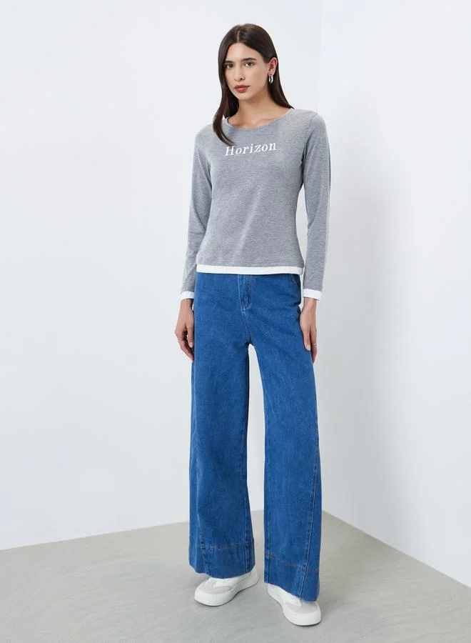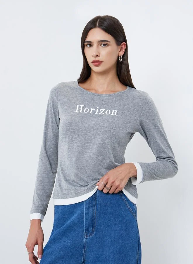 Styli Grey Embroidered Contrast Trim Regular Fit T-Shirt