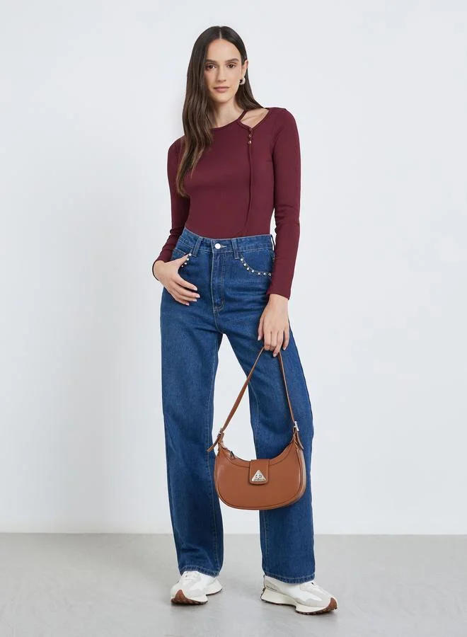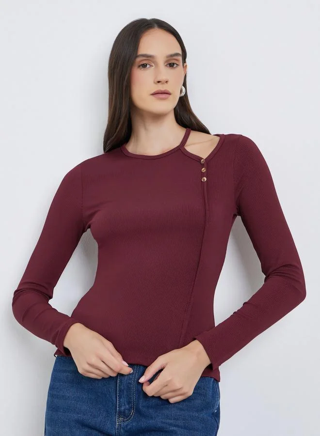 Styli Styli Burgundy Ribbed Knit Top with Cut-Out Detail