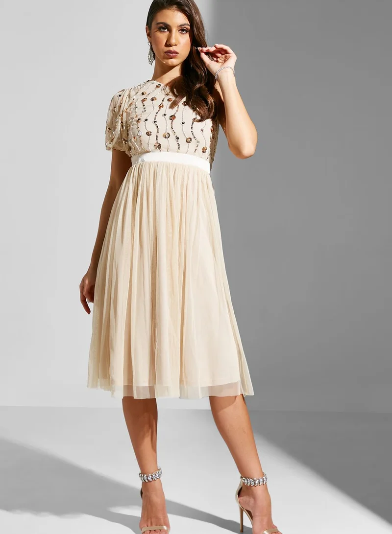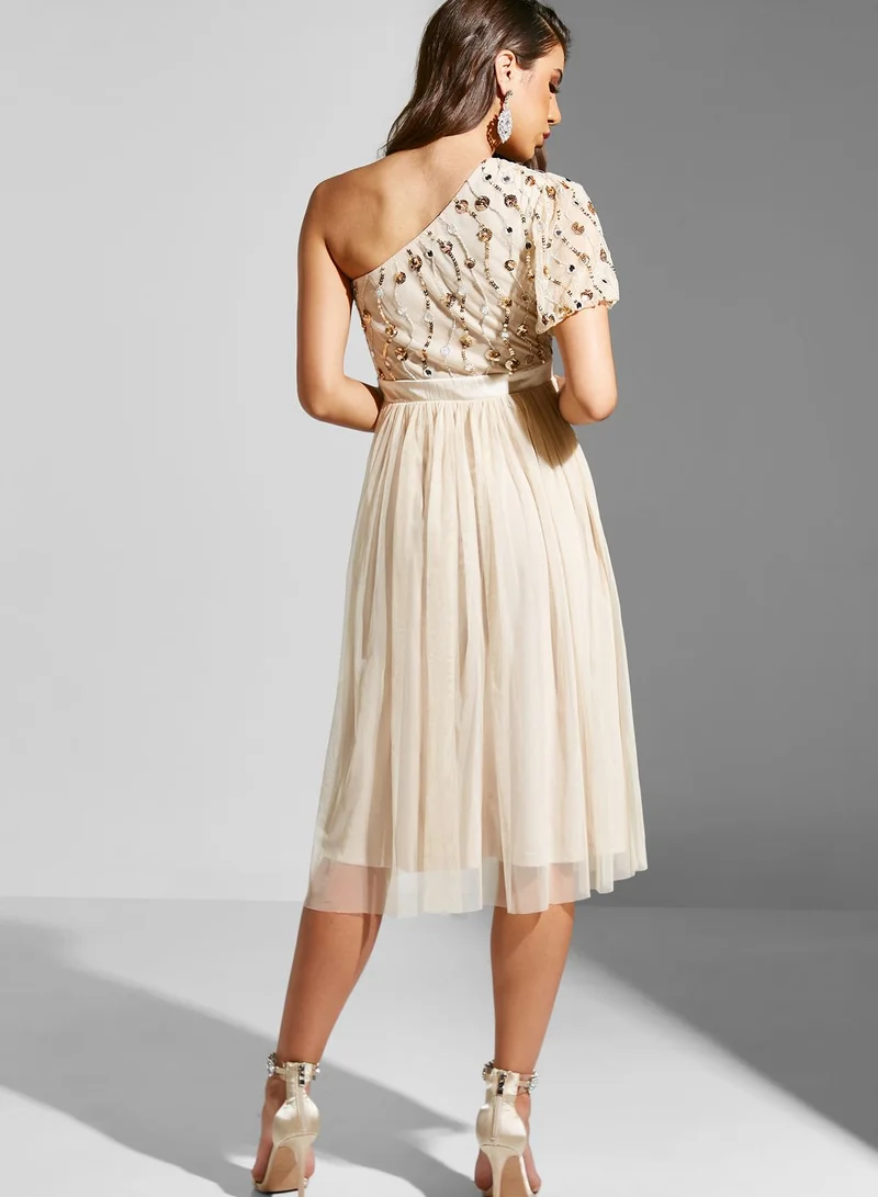 Amelia Rose One Shoulder Pleated Embroidered Dress