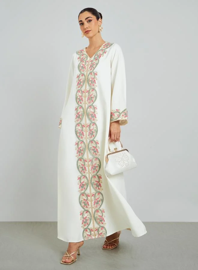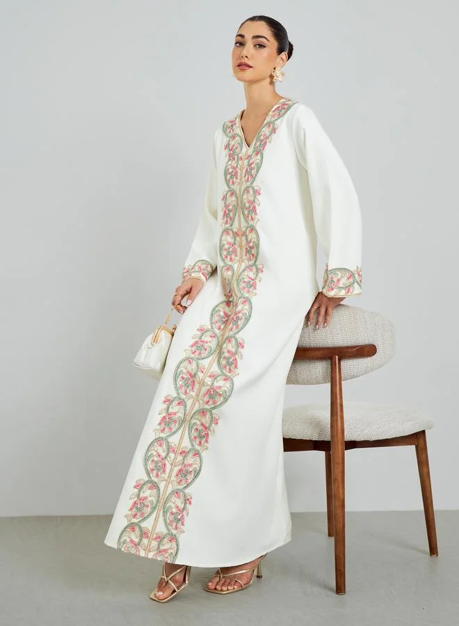 Amirah Cream Floral Embroidered A-Line Kaftan