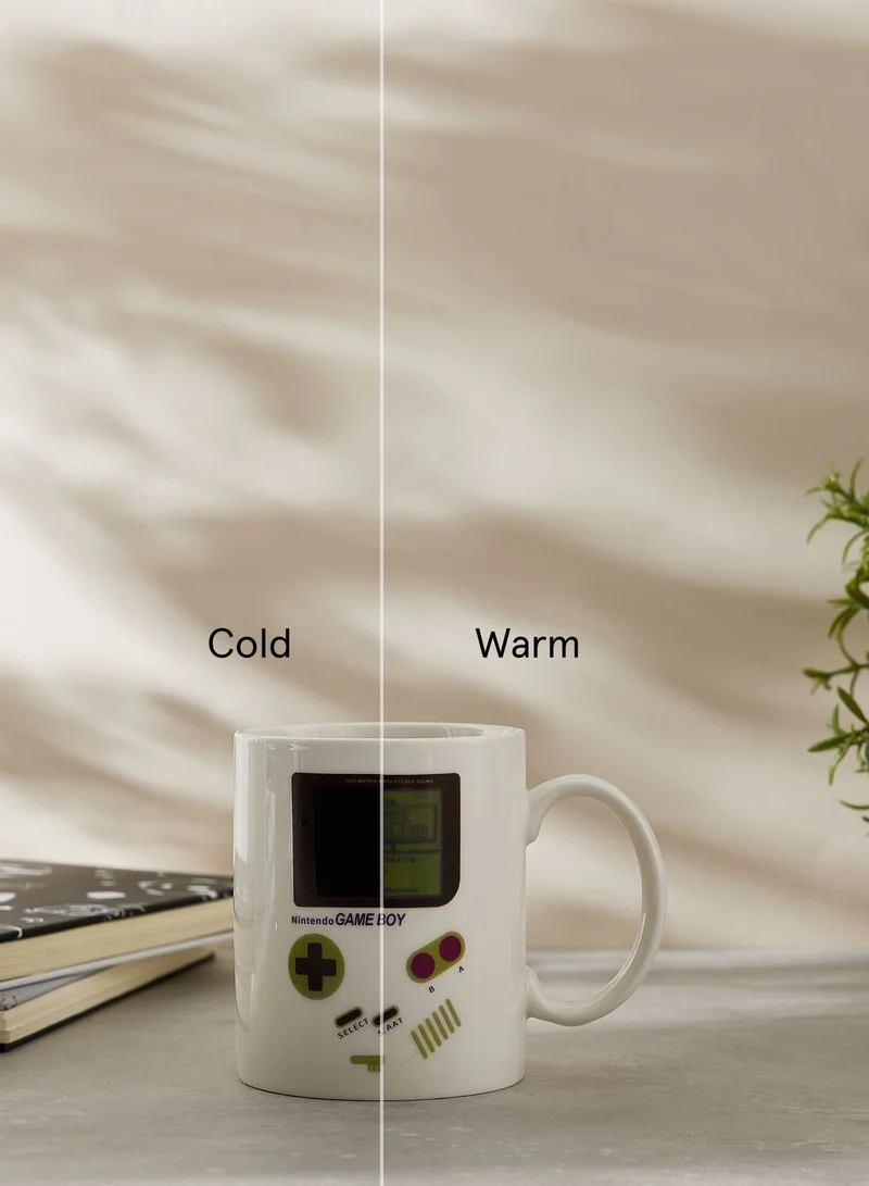 Pour in a hot beverage or water and watch as the outside of this mug changes its color and as it cools down, it reverts to the original color. Be amaze time and time again