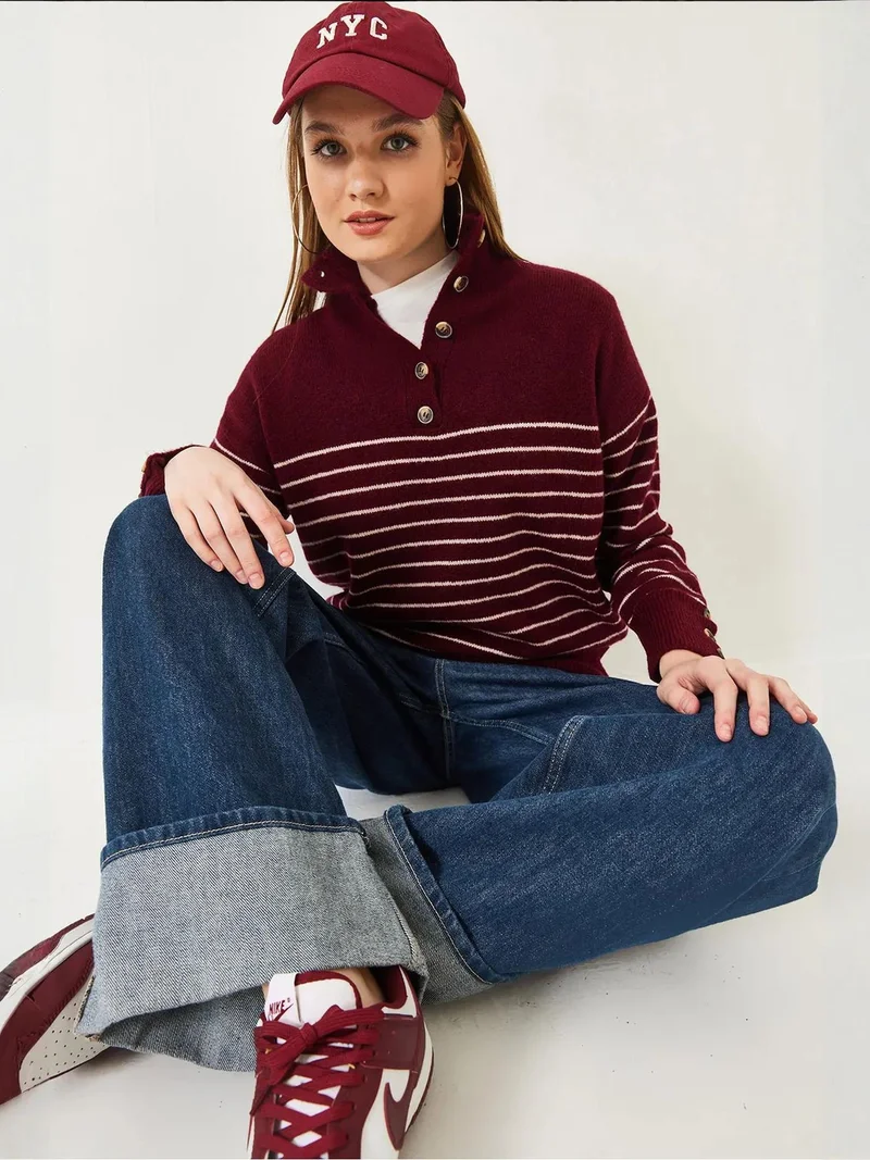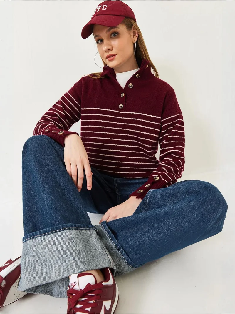 Introducing the Button Collar Striped Knit Sweater. This stylish and relaxed fit sweater is perfect for any casual occasion. Made from a soft blend of acrylic, polyester, and elastane, it provides comfort and flexibility. The button collar adds a unique touch, while the striped pattern offers a modern twist. With long sleeves and a standard length, this sweater is great for layering or wearing on its own. Upgrade your wardrobe with this versatile piece that balances comfort and chic effortlessly.