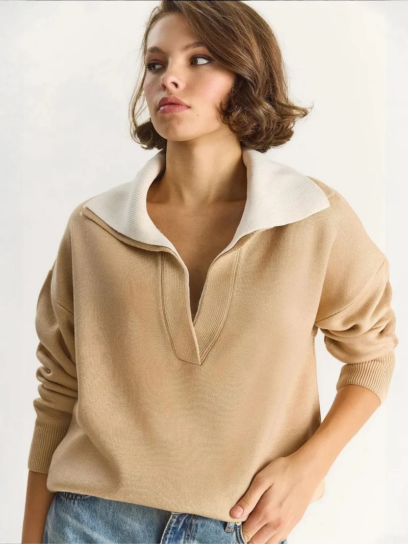 LUCCI Ribbed Color Blocked Sweater with Shirt Collar