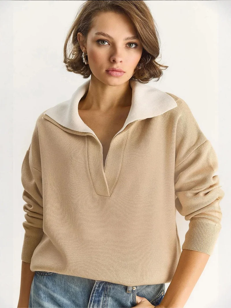 Bianco Lucci LUCCI Ribbed Color Blocked Sweater with Shirt Collar