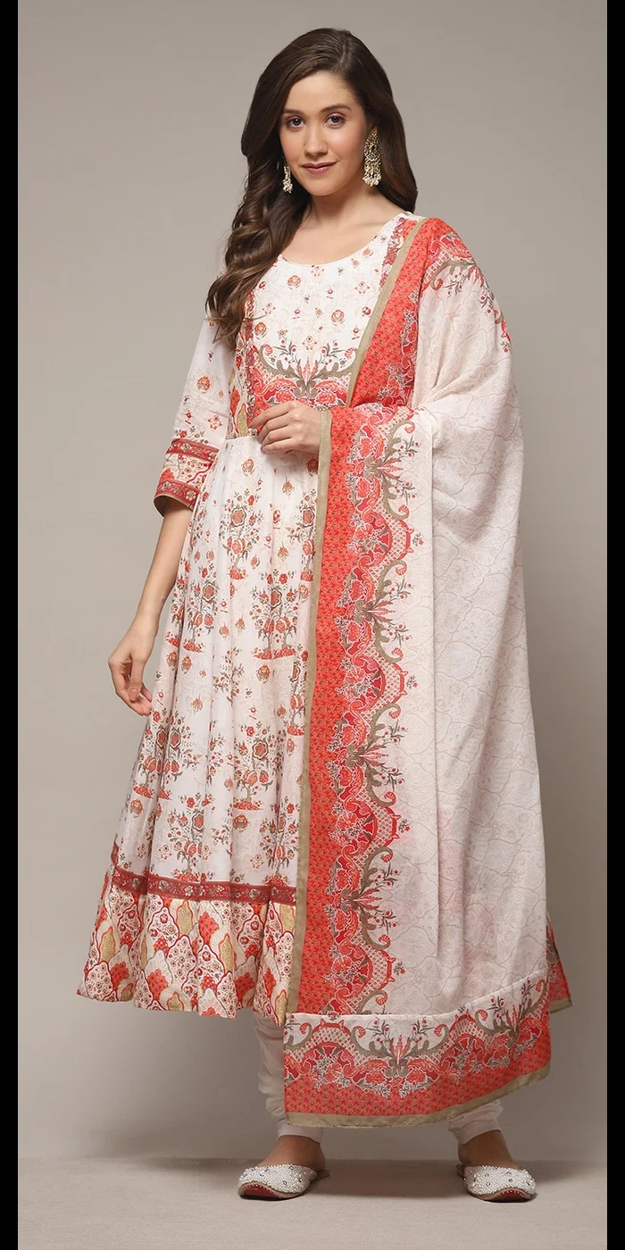 Biba Cream Cotton Anarkali Kurta Churidar Suit Set