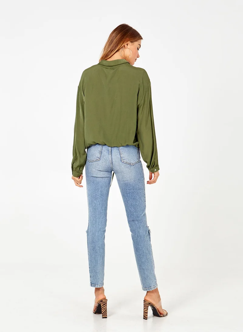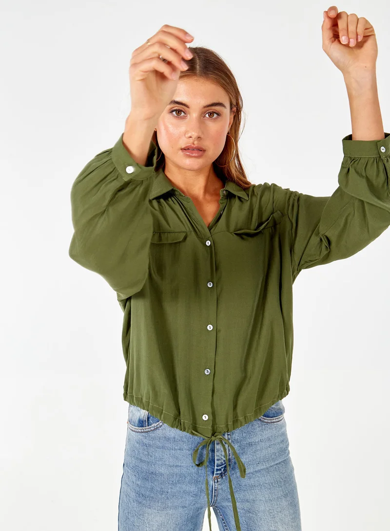 We're feeling those khaki, safari vibes with this gorgeous button front shirt. With wide sleeves gathered at the wrist, and a gathered waist with a tie at the front, this shirt offers a flattering loose fit. Featuring a a shirt collar and two pockets to the front
