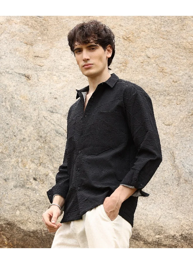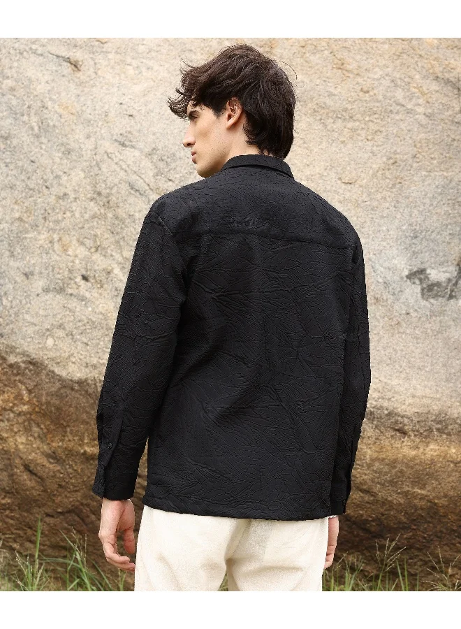 Men's Onyx Black Foliage-Tactile Shacket | رجالي | طوق منتشر | أكمام طويلة | نمط صلب | كاجوال ويومي | قميص واسع