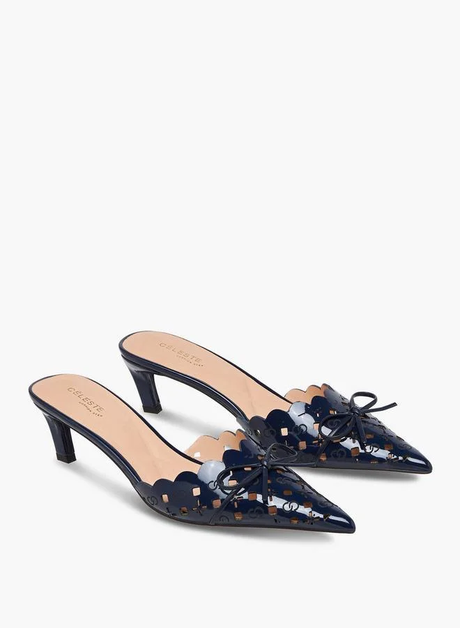Step out in refined elegance with these exquisite cut-out heeled mules, perfect for elevating any ensemble. The intricate cut-out detailing and charming bow accent provide a sophisticated touch, making these women's heeled shoes a versatile addition to your footwear collection. Designed for comfort and style, these slip-on mules feature a pointed toe and a stable heel, ensuring a confident stride for various occasions. Pair these elegant mules with tailored trousers or a flowing dress for a polished look.
