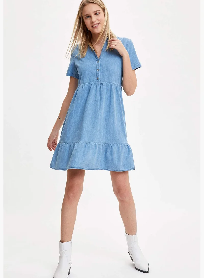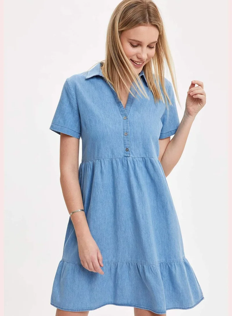 A denim short sleeve casual dress, suitable for everyday wear and casual outings.