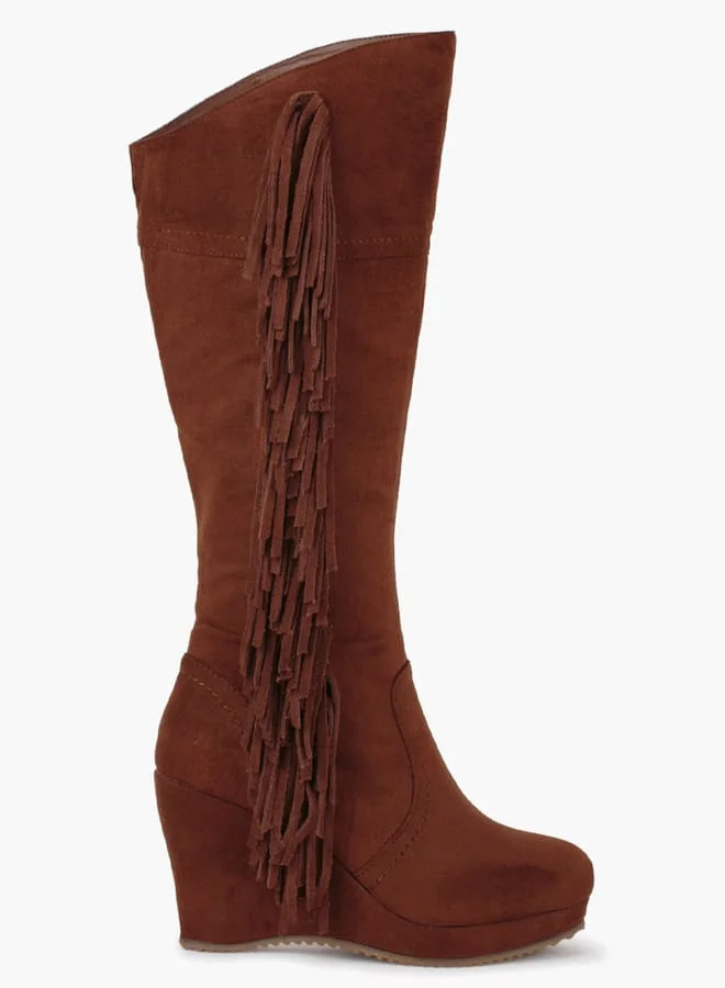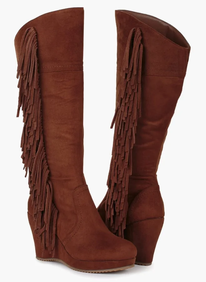 • These boots have a smooth finish and sport tassels on one side and a zipper on the other