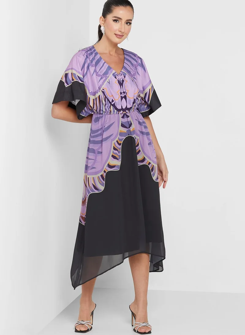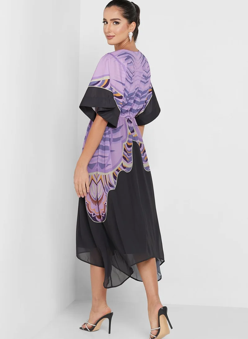Femi9 V-Neck Printed Cape Sleeve Dress