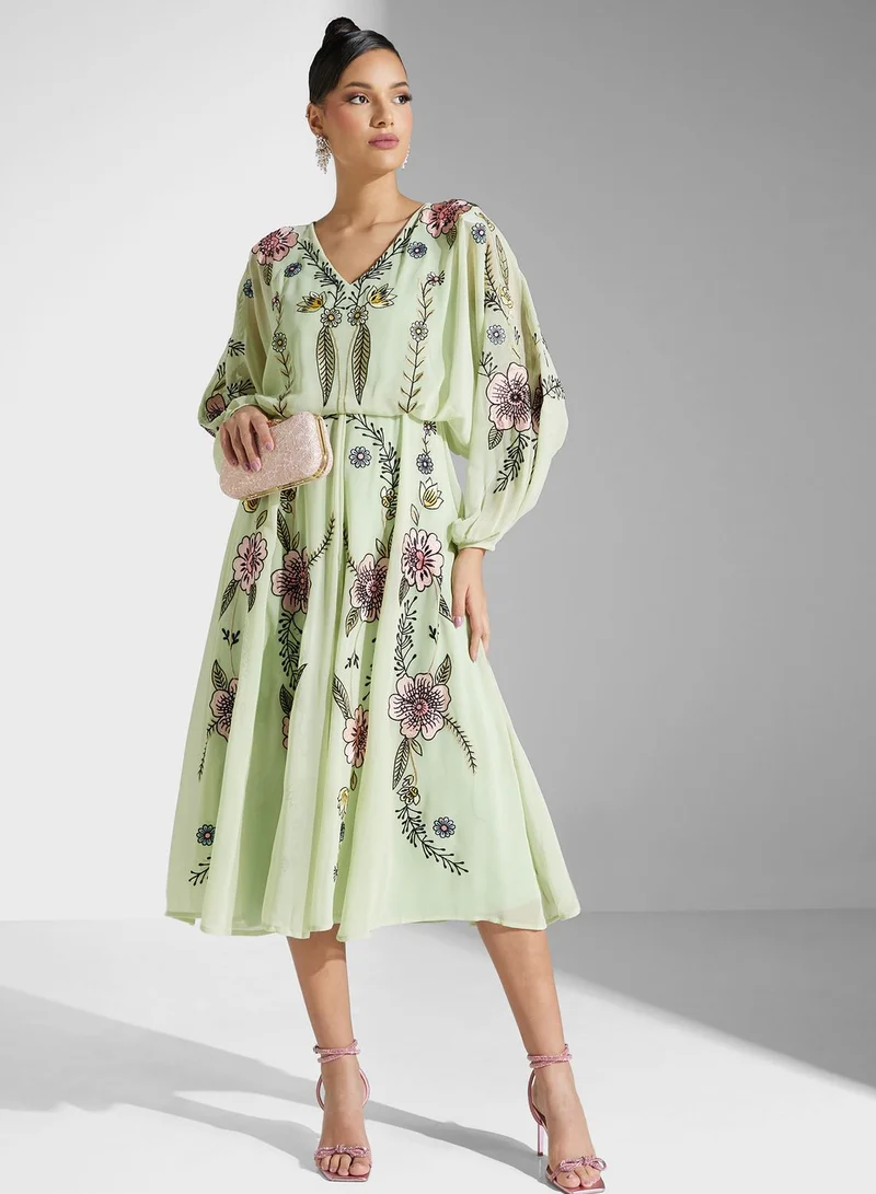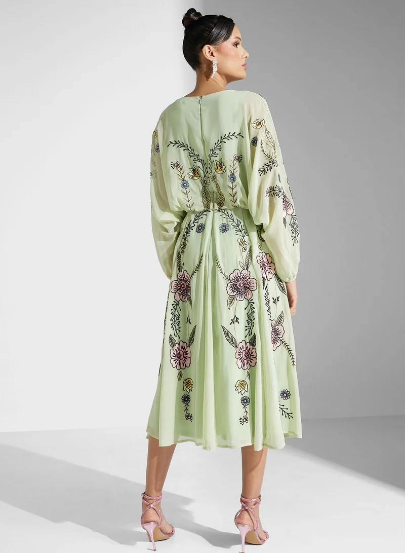 This elegant dress features a light green chiffon fabric with a delicate floral print, a cinched waist, and long sleeves, making it a charming choice for special occasions.