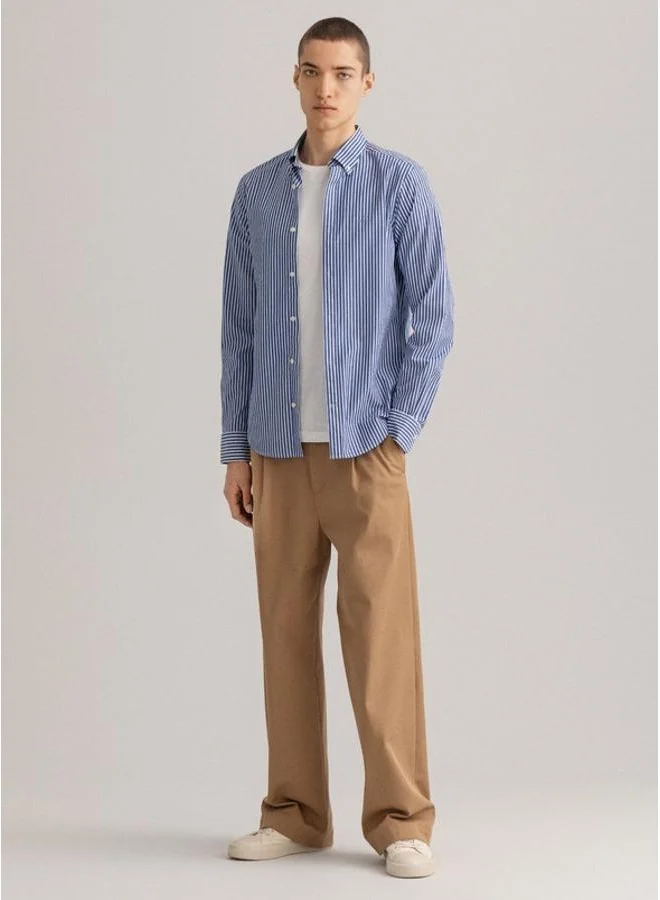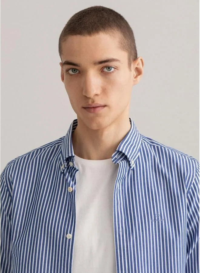 Crafted in a classic cotton broadcloth, this slim fit striped shirt has our signature button-down collar, logo embroidery, and locker loop at the back.