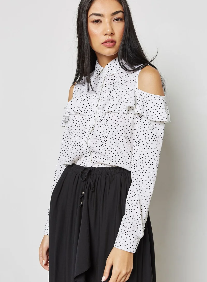 Ginger Polka Dot Ruffle Cold Shoulder Shirt