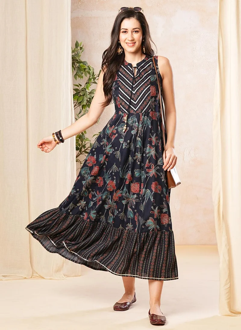 Embrace elegance in this blue mandarin collar maxi dress adorned with an allover floral print, sleeveless design, and tiered hem, perfect for festive occasions with its flared A-line silhouette and comfortable viscose rayon fabric.