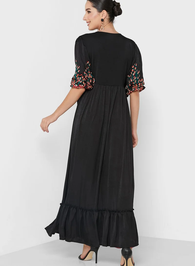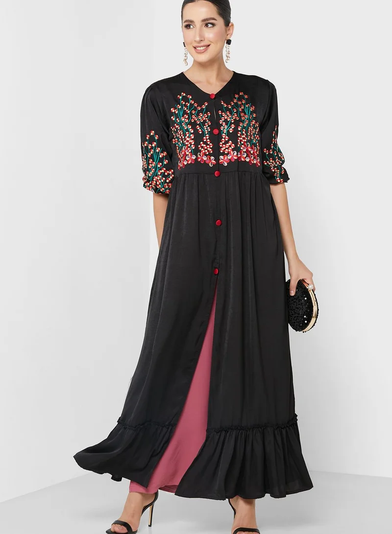 hayas closet Button Detail Balloon Sleeve Embroidered Dress