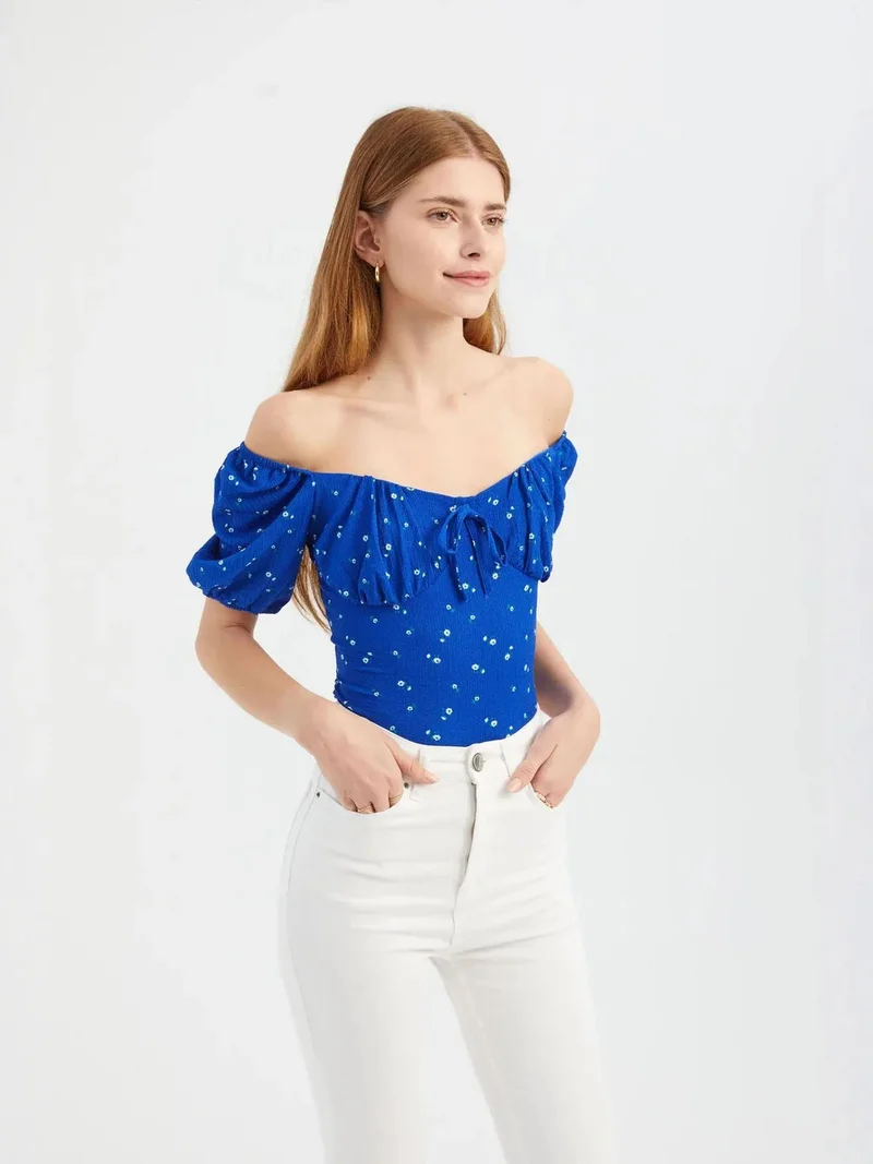 Step into spring with this Floral Sweetheart Neck Short Sleeve Blouse. The delicate floral pattern brings a touch of femininity to your wardrobe, while the sweetheart neckline adds a hint of romance. With its short sleeves, this blouse is perfect for those warm sunny days. The lightweight fabric ensures comfort and breathability, making it ideal for all-day wear. Whether you're headed to the office or out for brunch with friends, this blouse will effortlessly elevate any outfit. Pair it with jeans for a casual look or dress it up with a skirt for a more polished ensemble. Embrace the beauty of the season with this charming Floral Sweetheart Neck Short Sleeve Blouse.