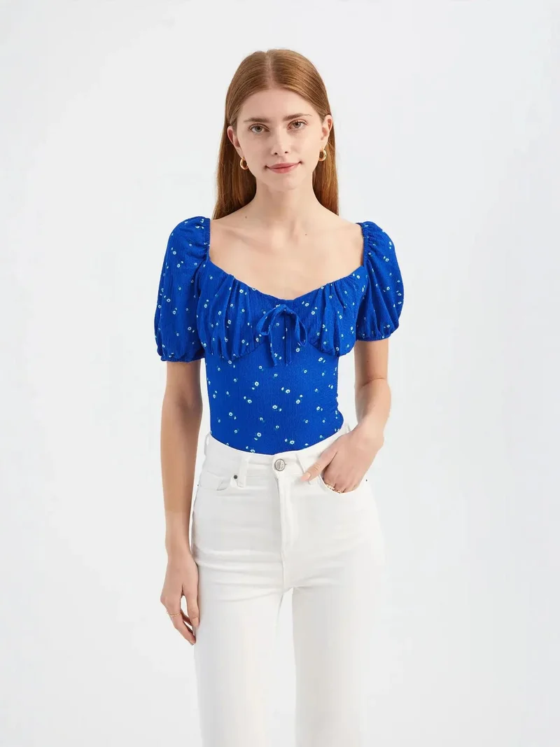 HICCUP Floral Sweetheart Neck Short Sleeve Blouse