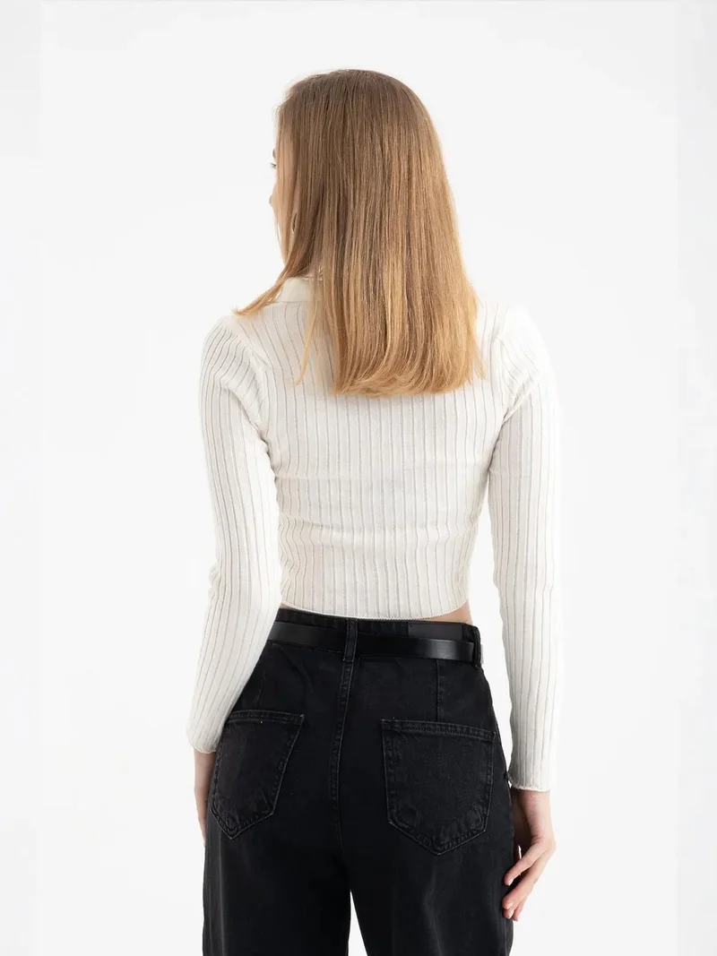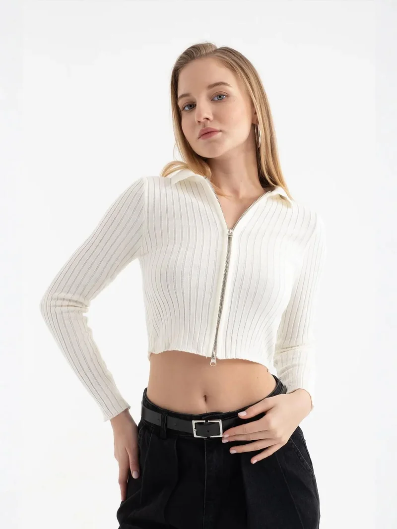 Polo Collar Ribbed Zippered Cropped Cardigan