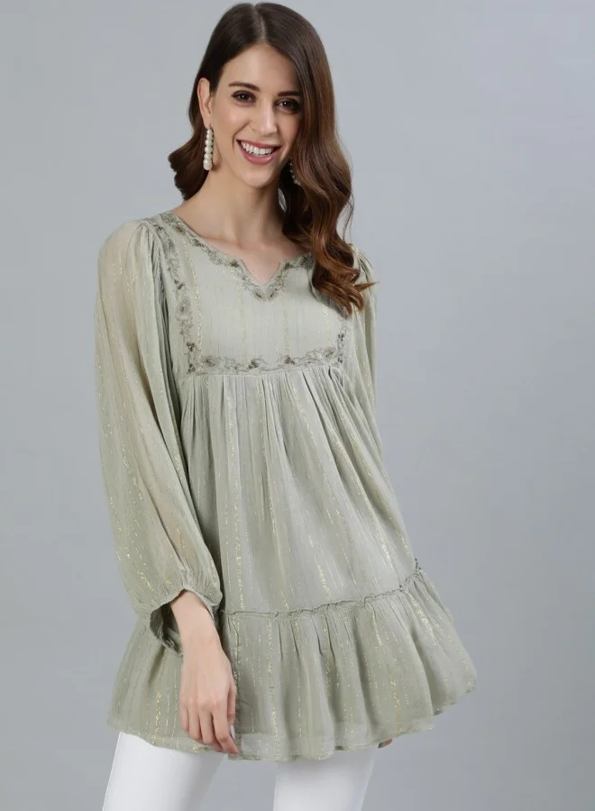 ISHIN A-Line Fit Self Design Pattern V Neck Three Quarter Sleeves Grey Colour Woven Georgette Tops