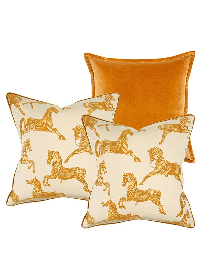 Rich colours and bold patterns come together to dramatic effect in our Arie bundle. It includes two beige cushions with carousel horses dancing across the front and an orange velvet accent cushion.