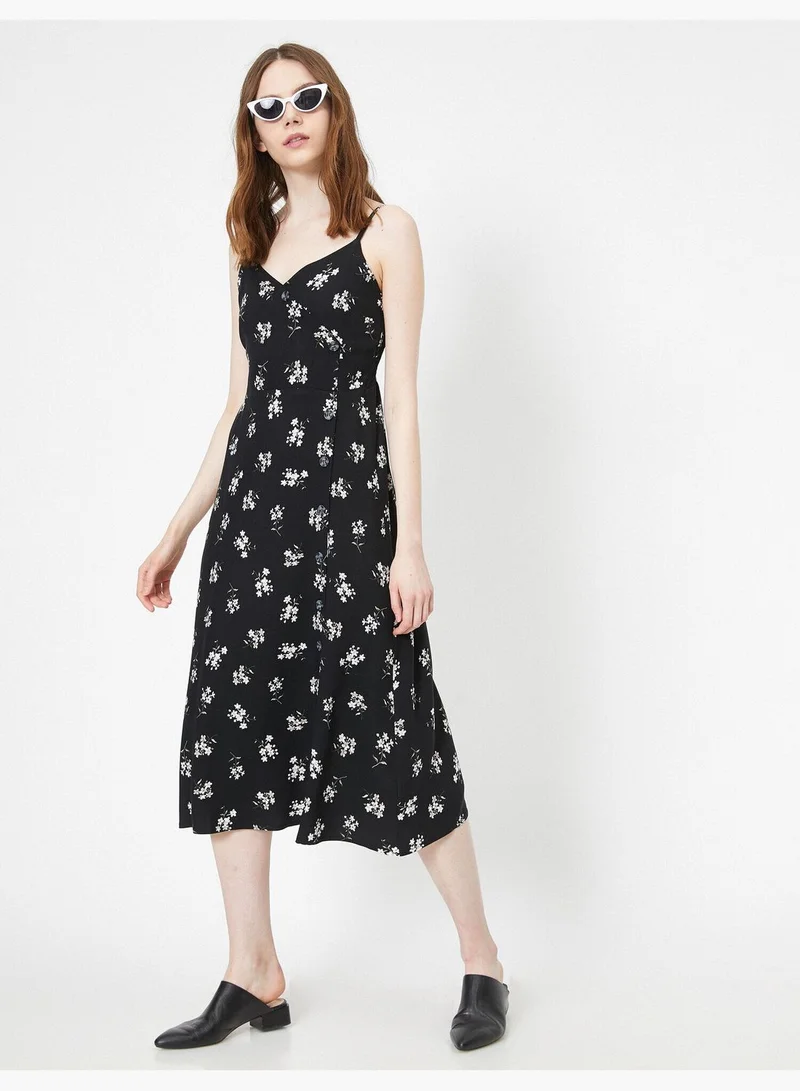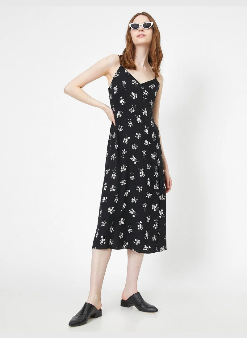 V Neck, Spaghetti Strap, Sleeveless, Button Detailed, Patterned, Midi Dress