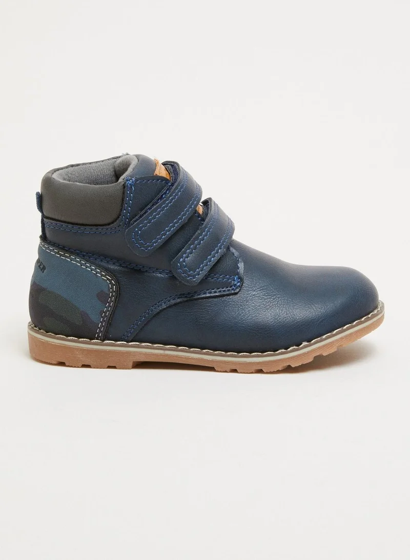 An appealing way to add dapper to your kid's dressing, this pair of high top boots is a trendy choice. Featuring a camouflage printed panel and highlighted with stitch detailing, these boots are great for casual outings. The hook and loop closure lends comfort to the pair.