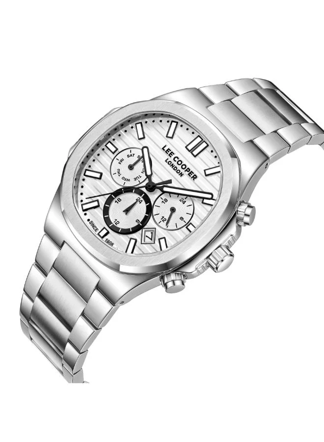 The Lee Cooper LC08272.330 features a textured silver square dial combined with a silver metal bracelet, delivering a clean and contemporary look. Designed as a business watch for men, it offers multifunction quartz performance with 5 ATM water resistance, making it suitable for daily and professional use