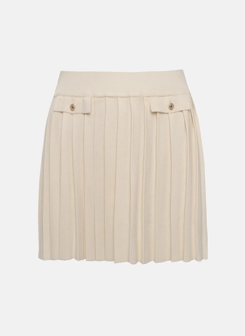Flared mini skirt with a wide waistband and imitation pockets at the front, made from fine-pleated knitted jersey to form a set with the matching cardigan and top.- mini length- flared model- high waistline- elasticated waistband- imitation front pockets- golden fittings