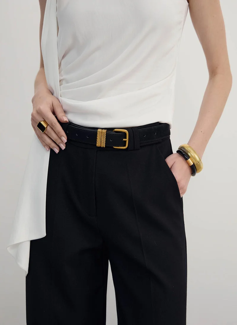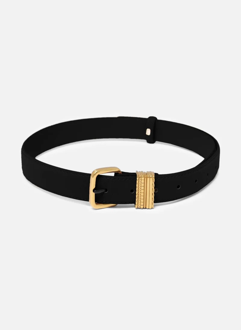 Wide leather belt with a slim rectangular buckle and accent textured loop in bright golden metal.- adjustable length- wide metal loop- additional tonal leather loop- golden fittings