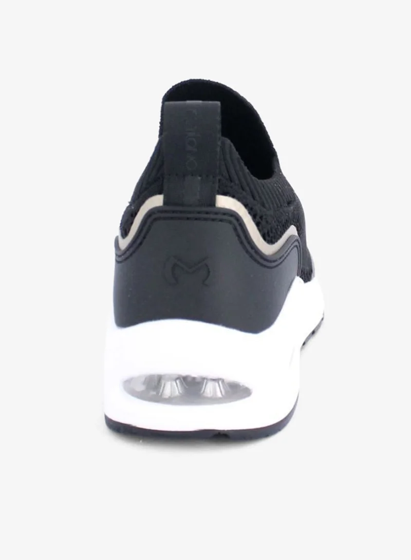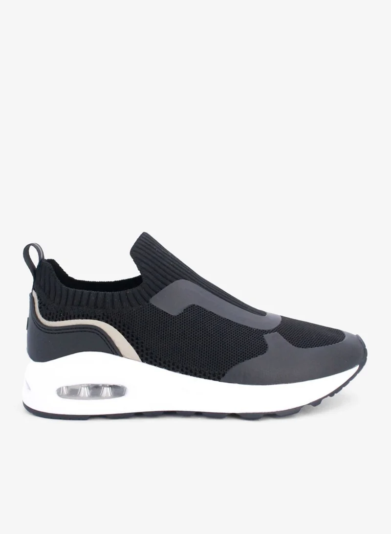 Kamila slip-on sneaker with a sleek, modern design featuring a ribbed sock-like collar, glossy overlays, and a cushioned white sole with visible air pockets for enhanced comfort. Ideal for casual wear, light workouts, or walking, offering both style and functionality for all-day comfort and support. Material - Textile, Heel Height - Under 2cm
