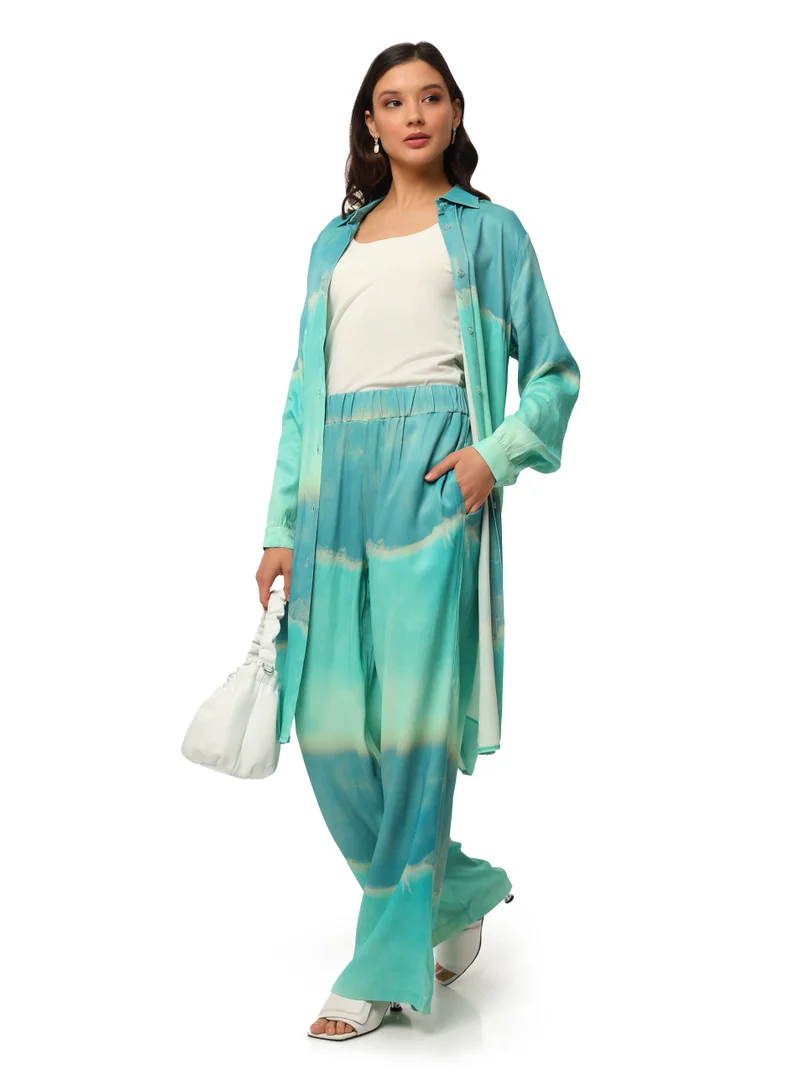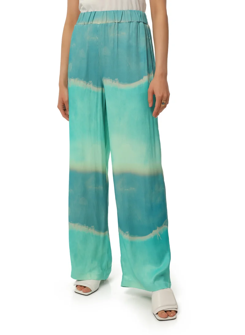 Free cut pants from capsule collection «Mermaid» brand Mitica Luna. Elegant tai-dae print impresses with exquisite shade transitions. Such a spectacular model, even in a boring office, will remind you of vacation and the gentle sea. The waistband is elastic - thanks to this pants fit perfectly and do not hinder movement. Made from 100% viscose with satin finish, very soft and silky. About the brand: The Mitica Luna brand embodies the bold collaboration of Italian sports chic and Japanese grunge trends. Wide jeans, knitted tops, tracksuits (tracking suits) - models collection harmoniously combine comfort and brightness. Volumetric planting, pastel tones and soft structural fabrics are complemented by spectacular stones, rhinestones and sequins. Mitica Luna fans are women who appreciate convenience and want to look original, stand out and attract attention.