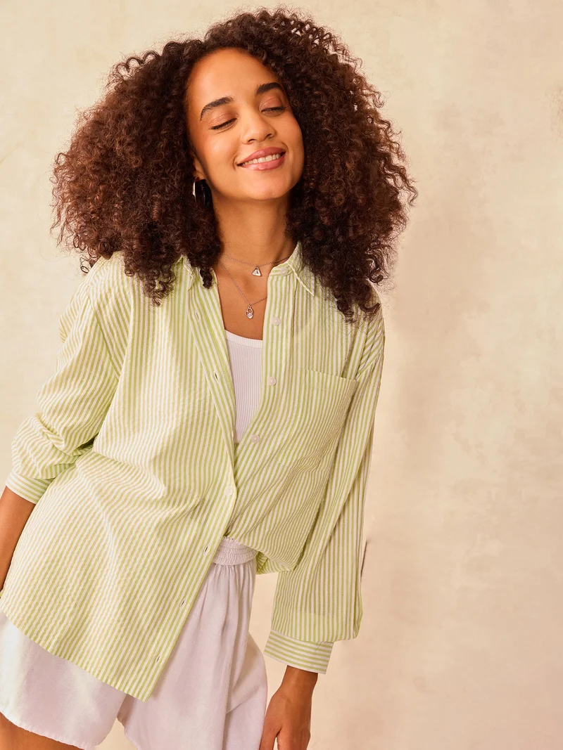 This green oversized stripe shirt brings a fresh and vibrant feel to your summer collection. The lightweight fabric and vertical green stripes make it a delightful choice for outdoor picnics and casual coffee dates. Style it as a layer for garden parties or wear it comfortably during long sightseeing trips.