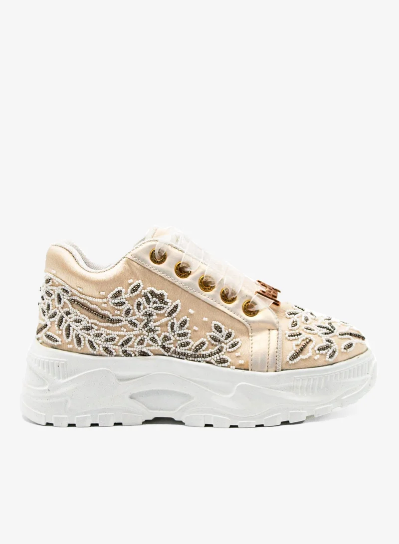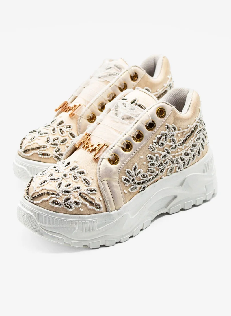 Add understated elegance to your sneaker collection with The Iska Luxury Buttermilk Satin Handmade Embellished Trainers by RETTROSE. These women’s trainer shoes blend a sleek, modern silhouette with intricate detailing for the perfect balance of comfort and high-end style.
