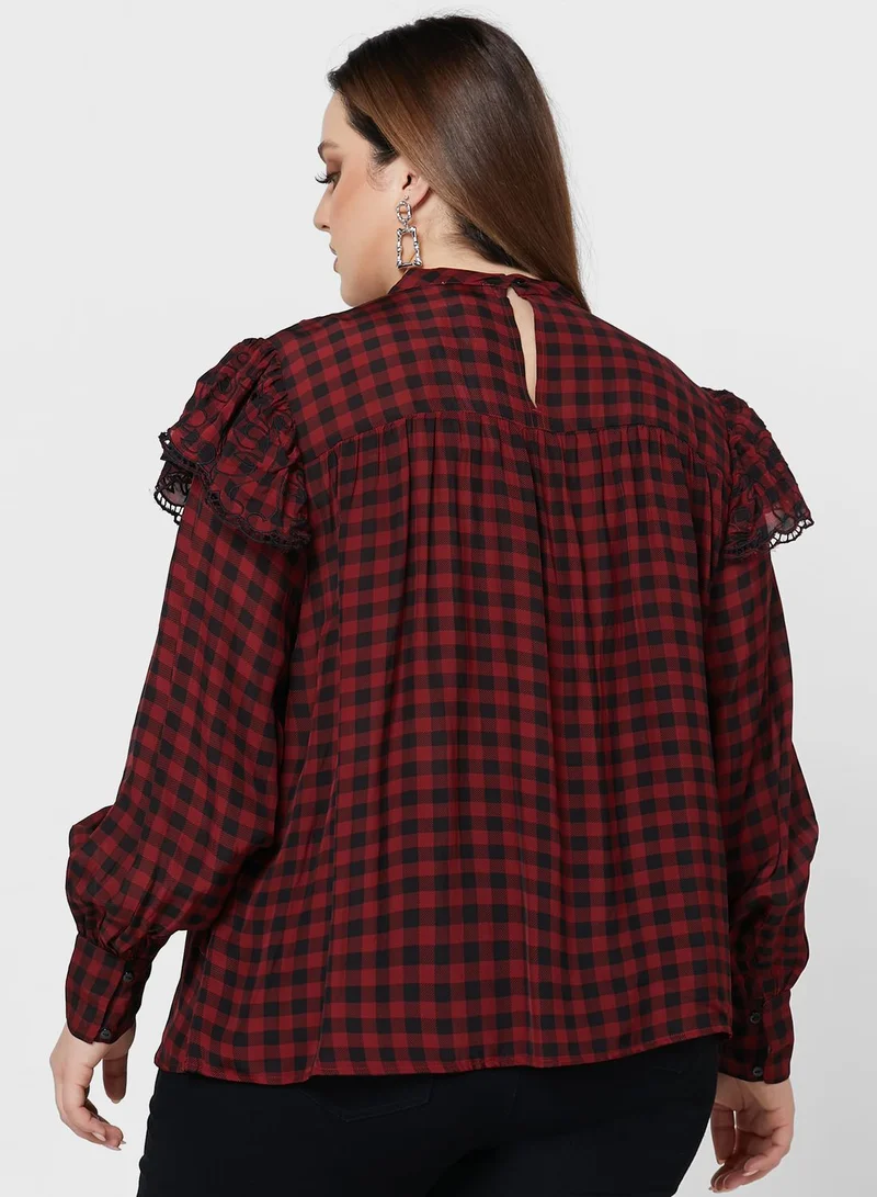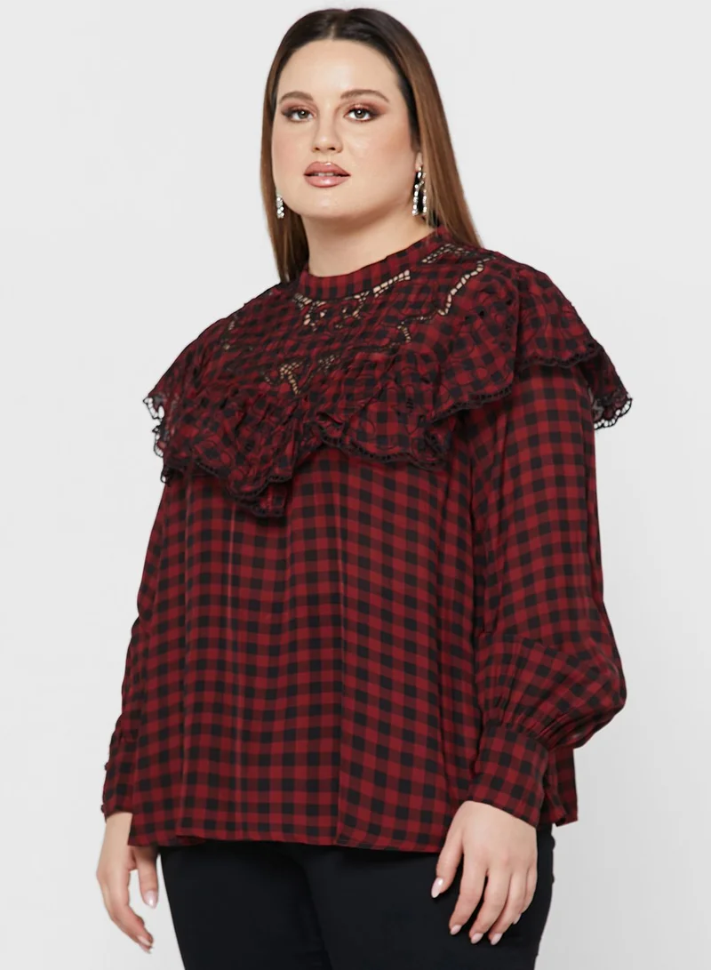 Chic ruffle details on this checkered blouse make this an elevated everyday essential.