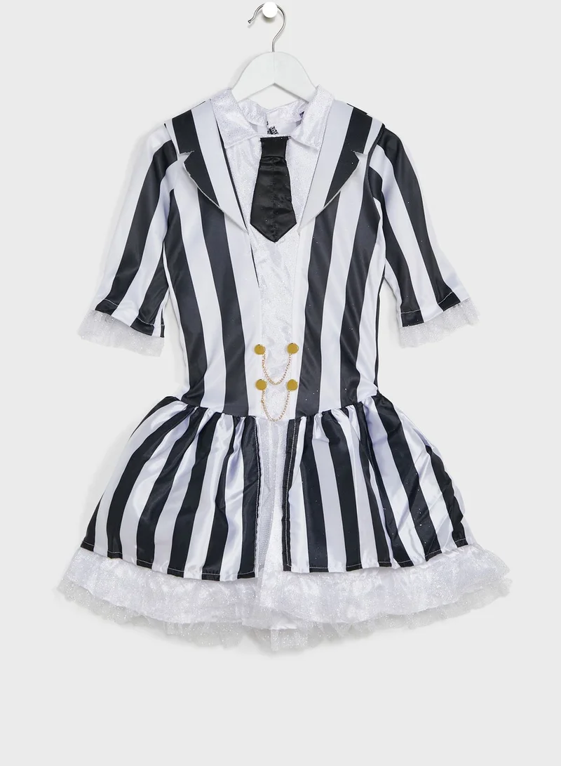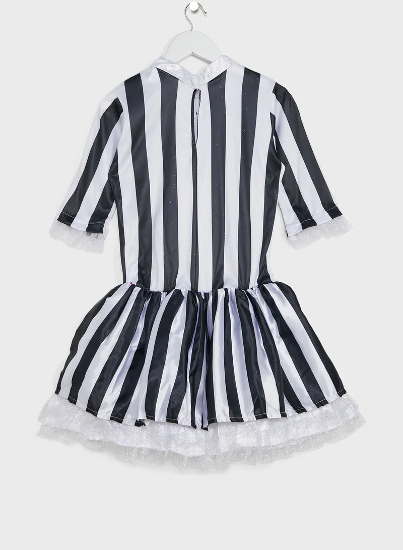 Rubies Beetlejuice Girls Costume is ideal for Halloween party, pay tribute to the classic ghost with this Beetlejuice Costume black and white. The dress is made of polyester, which is comfy enough to wear through the night. This spooky costume includes dress with attached tie, so you can easily complete the Halloween look with a wig and makeup.