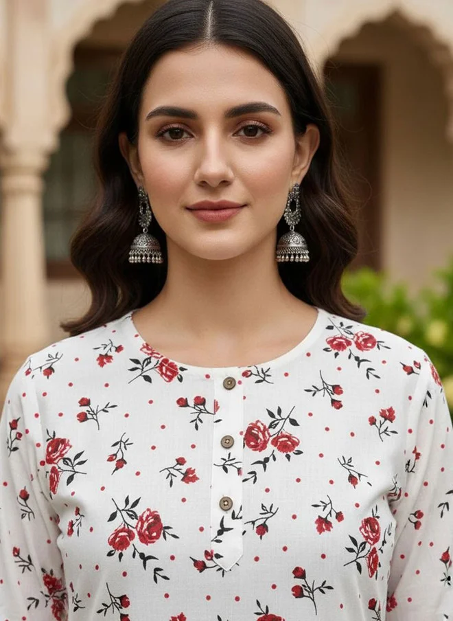 This beautiful knee-length kurta features a floral print on a white background, designed for festive occasions. It has a round neck and three-quarter regular sleeves, providing a comfortable fit. The straight shape and side slits enhance its style, making it perfect for casual or semi-formal wear. Made from blended viscose rayon, this kurta is both stylish and easy to care for.