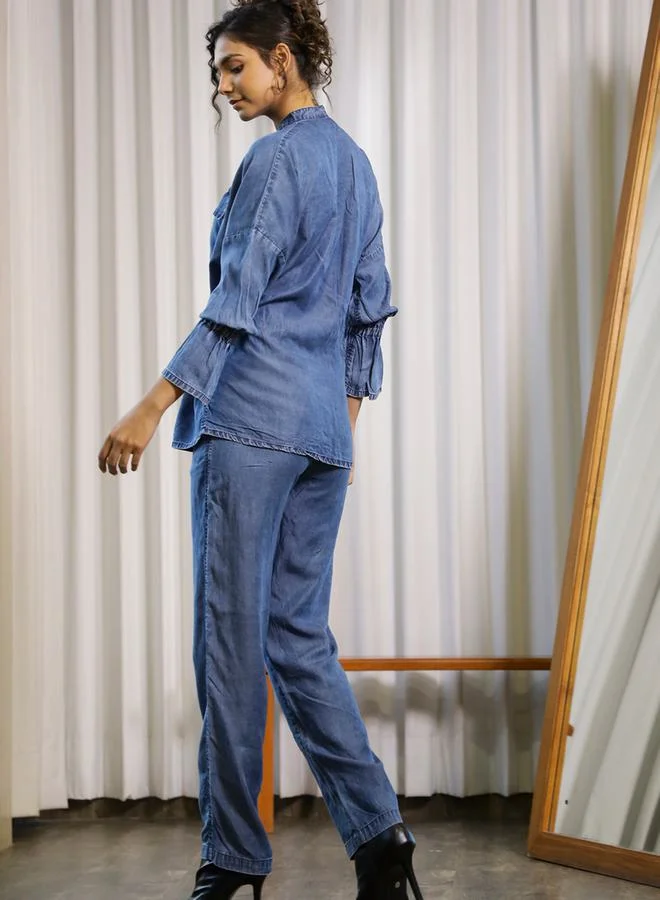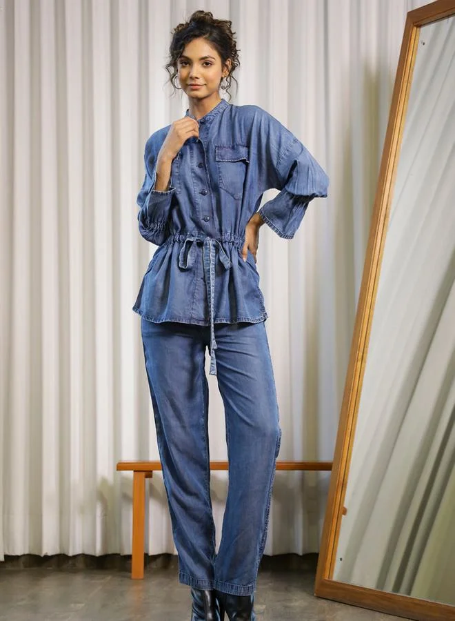 sanskrutihomes Denim Look Mandarin Collar Flap Pocket Shirt with Tie Up Detail & Pants Co-Ord by Styli