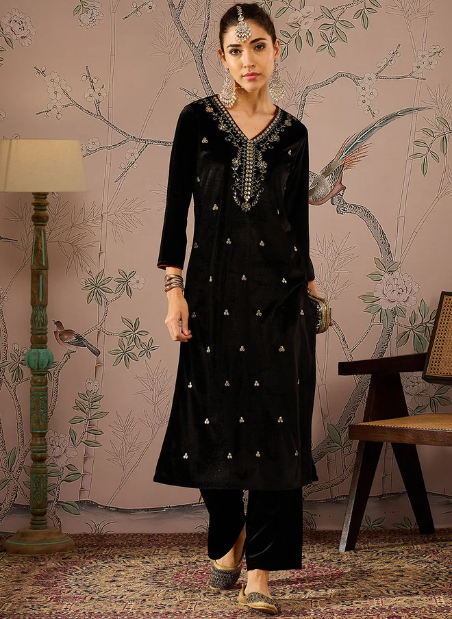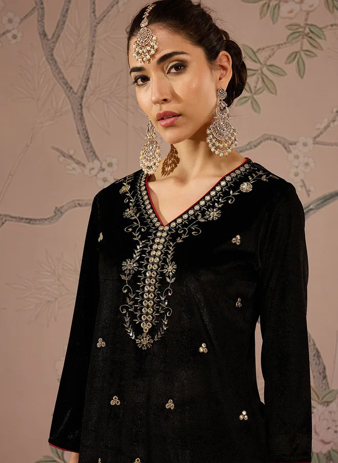 Black Floral Embroidered Velvet Kurta for Women