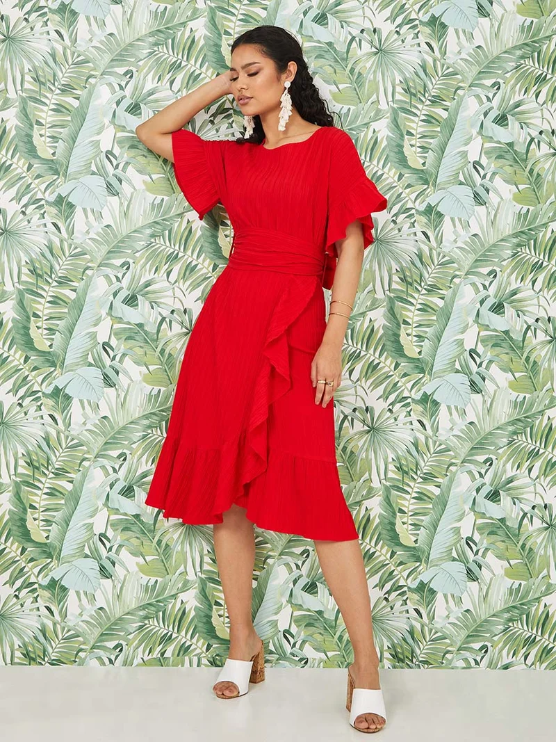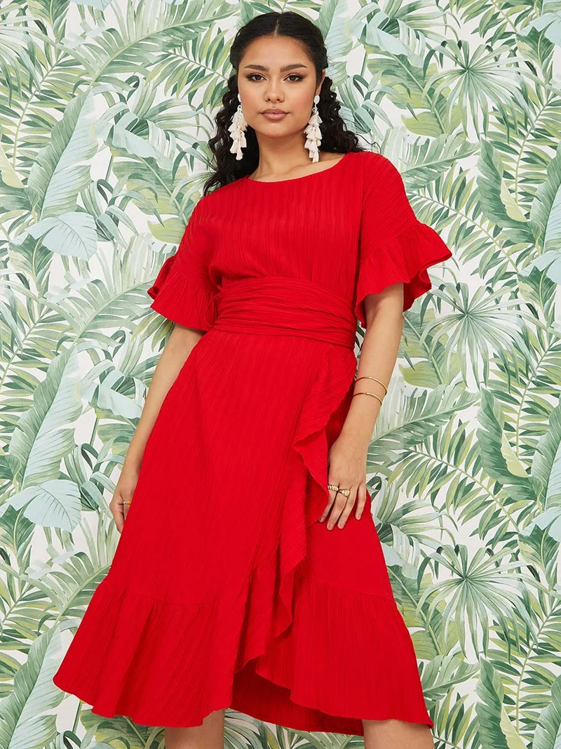 Styli Boat Neck Frill Detail A-Line Midi Dress with Self Tie Belt