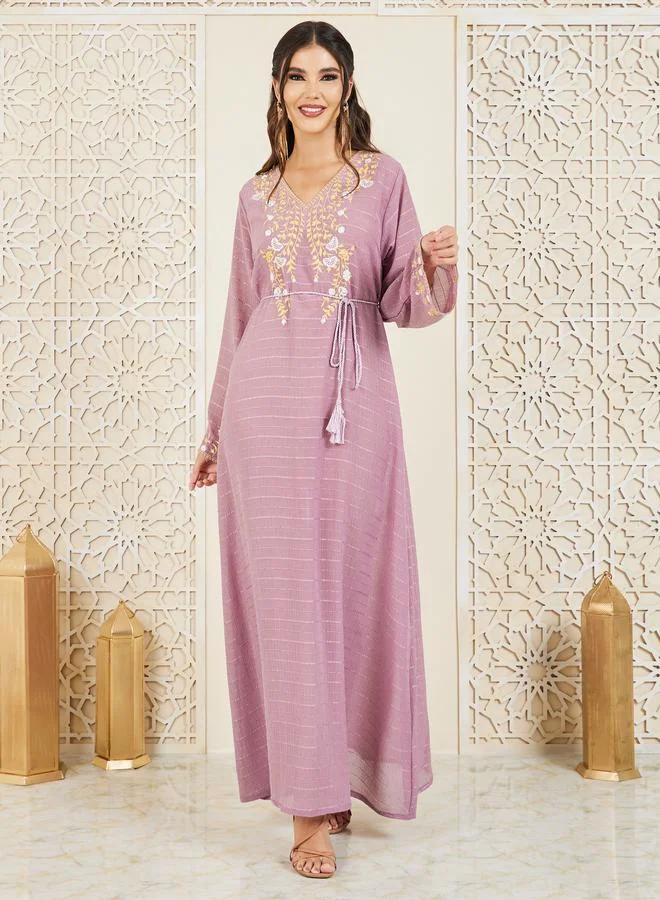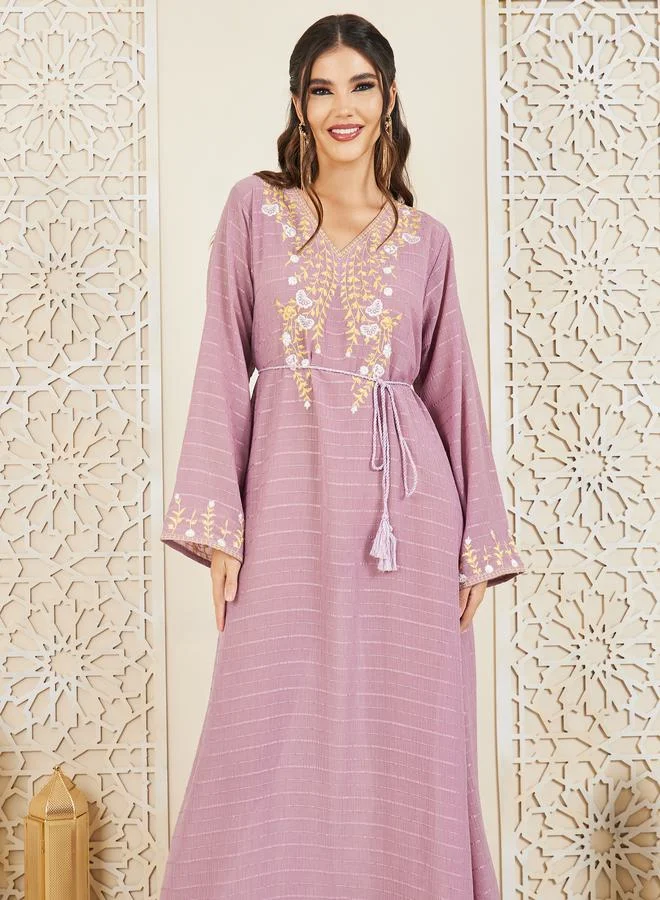Styli Embroidered Textured Jalabiya with Tie Up Cord