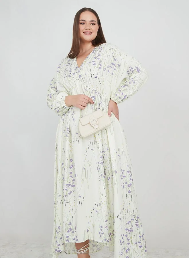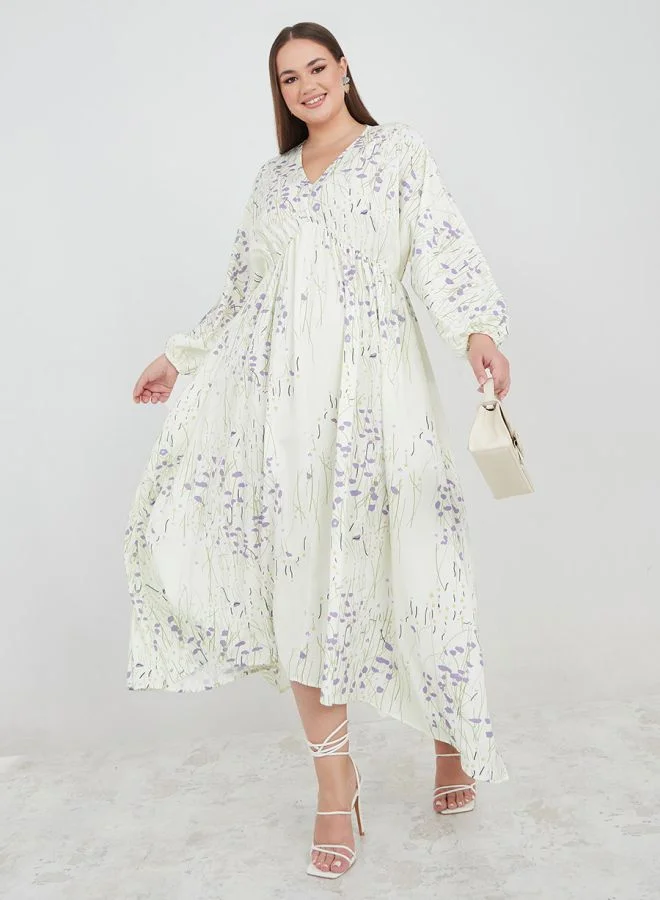 Styli Floral AOP V Neck Asymmetric Hem Maxi Dress
