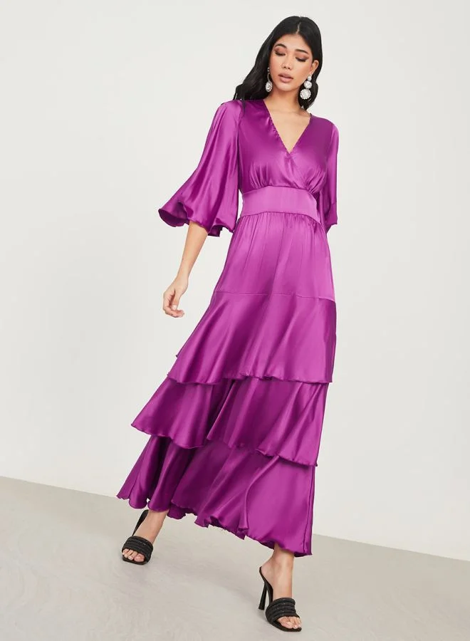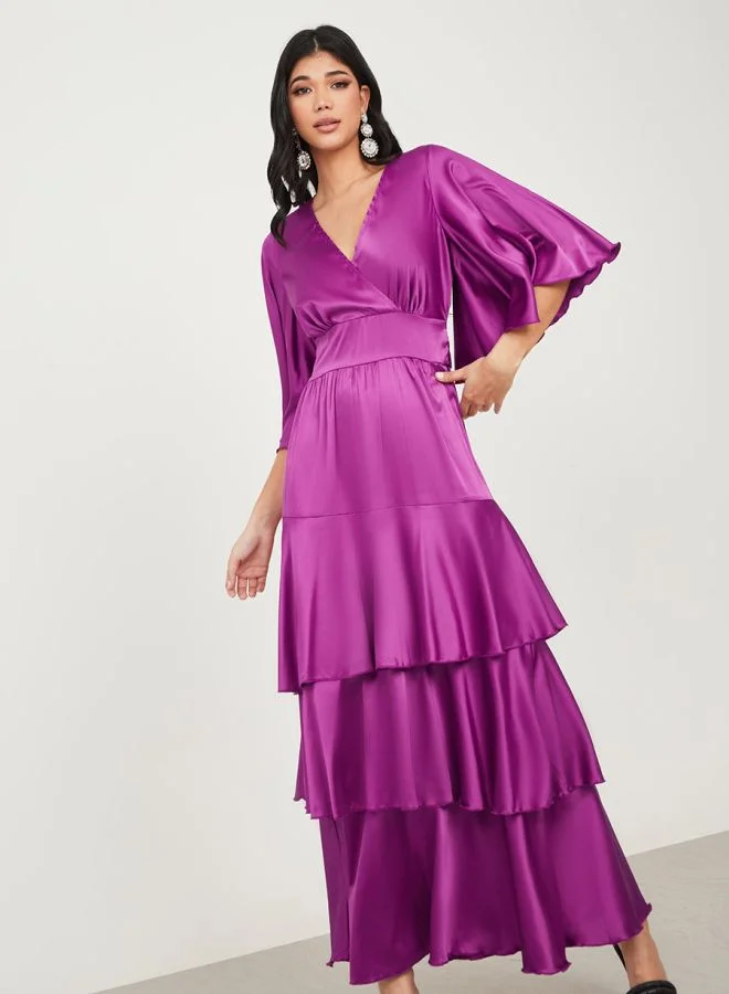 Styli Flute Sleeve Layered Satin Maxi Dress