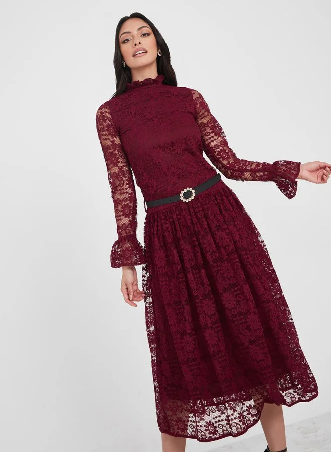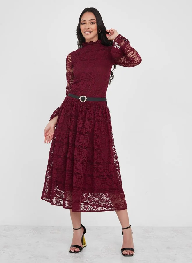 Styli High Neck Lace Insert Midi Dress with Belt