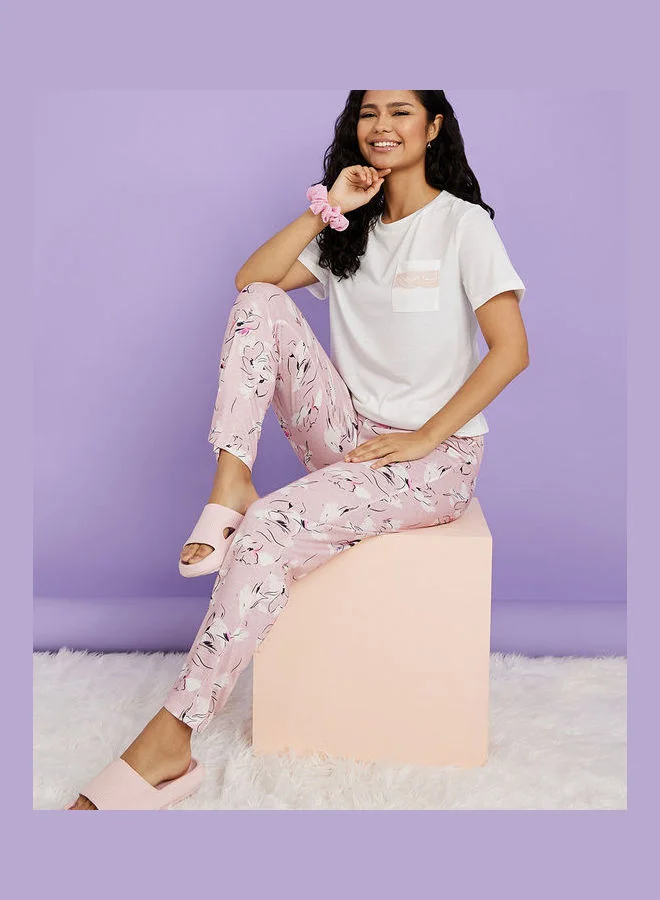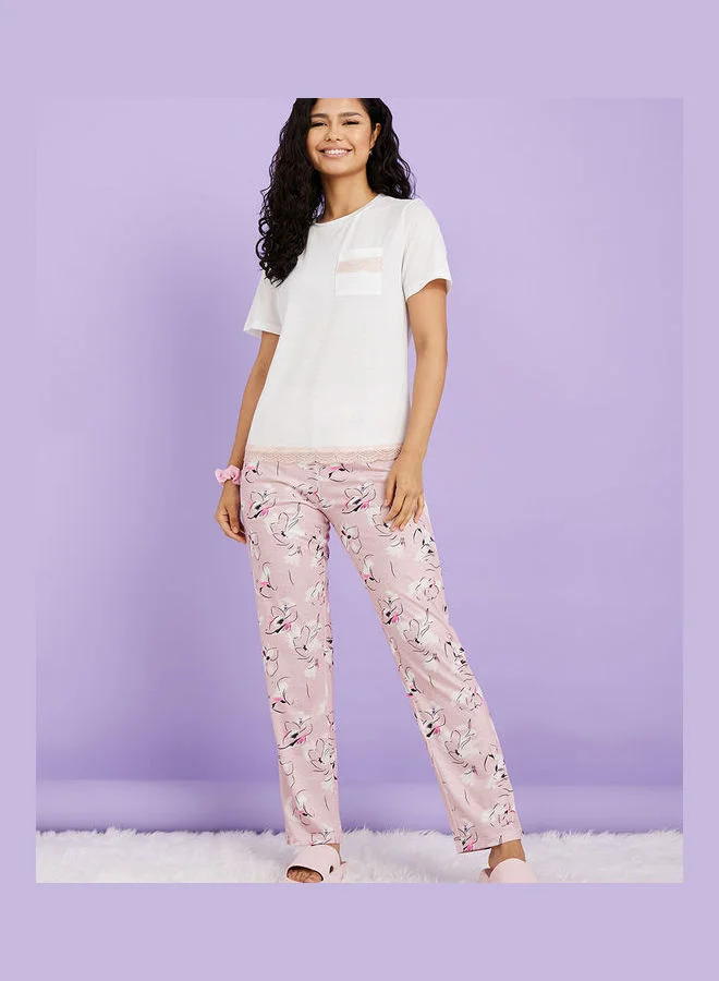 Styli Lace Trim Pocket Tshirt and Floral Print Pyjama