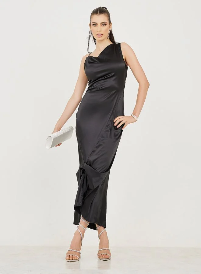 Styli One Side Shoulder Knot Detail Satin Maxi Dress