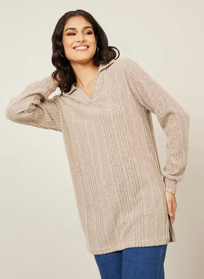Styli Oversized Brushed Rib Collared Neck Longline Polo T-Shirt