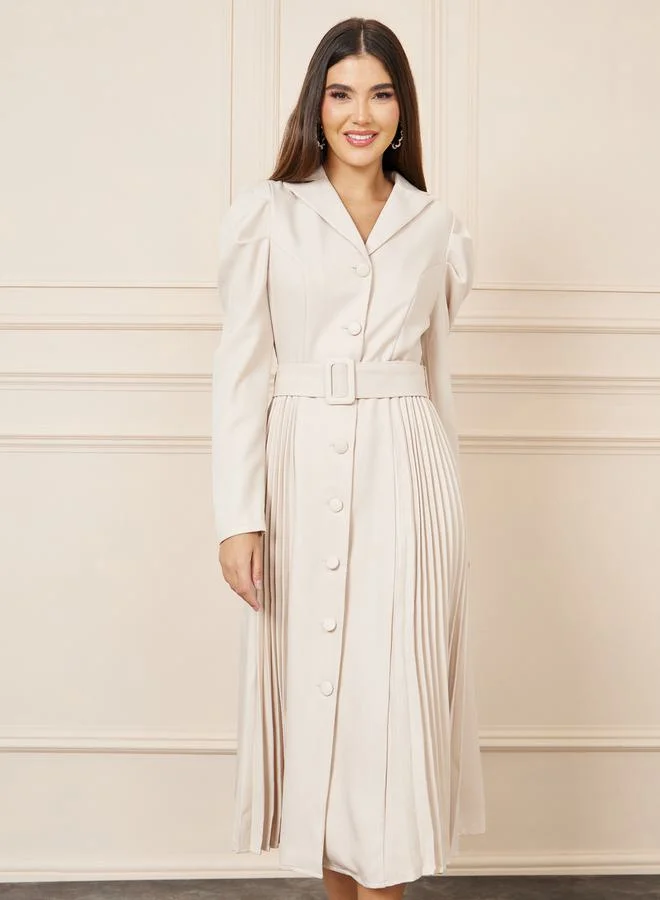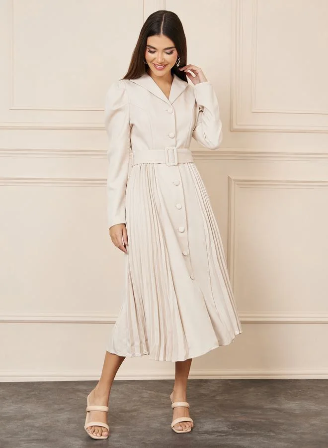 Styli Pleated Belted A-Line Shirt Midi Dress